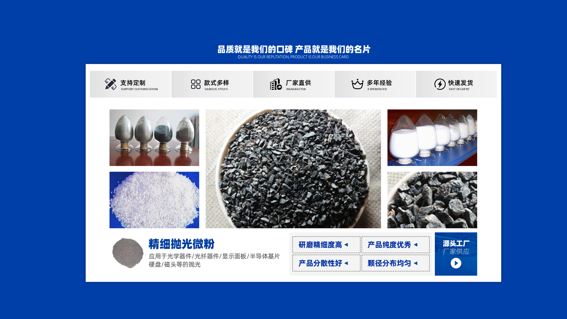 18年來(lái),雙岳磨料經(jīng)過不斷發(fā)展和技術(shù)的積累,凝聚了 一批經(jīng)驗(yàn)豐富,素質(zhì)精良的專業(yè)人才。我們始終堅(jiān)持“客 戶為本”原則發(fā)展,以誠(chéng)信經(jīng)營(yíng)為基礎(chǔ),以服務(wù)滿意為保 證,歡迎新老客戶來(lái)廠洽談業(yè)務(wù)。